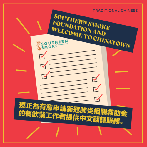 您是否需要或身邊有親友需要緊急經濟援助,並在食品和飲料行業工作?Southern Smoke Foundation(SSF)是一個為食品和飲料行業從業人士提供危機救助的組織。 現在,Welcome to Chinatown已與SSF展開合作,為需要協助完成申請的申請人提供免費翻譯服務。